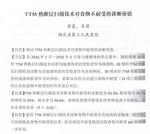 大會(huì)論文匯編收錄了湖北省第三人民醫(yī)院編寫的《TTM熱斷層掃描技術(shù)對(duì)食物不耐受的診斷價(jià)值》,研究結(jié)果顯示采用TTM熱斷層掃描技術(shù)診斷食物不耐受具有較高的靈敏度、特異性。